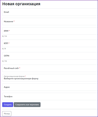 Для добавления новой организации необходимо нажать на кнопку «Добавить организацию», выбрать ее роль и заполнить следующие поля: