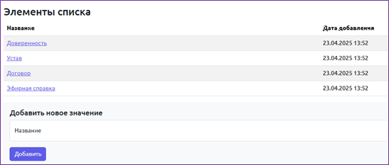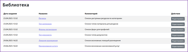 В разделе происходит управление списками, используемыми при создании организаций, проектов и ресурсов.