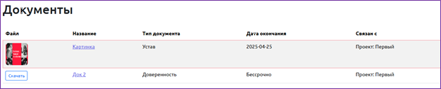В разделе автоматически формируется база всех документов, загружаемых в Систему с указание срока действия и подсветкой просроченных документов, проектов, к которым они относятся, и возможностью скачивания.