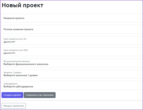 Для добавления проекта необходимо нажать на кнопку «Новый проект» и заполнить следующие поля: