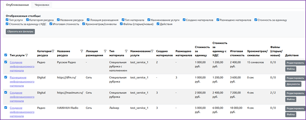 В зависимости от типа услуги – Размещение информационного материала либо Создание информационного материала – указанного при добавлении ресурса к проекту, а также количества материалов, формируется форма отчетности, куда, исходят из типа, добавляются медиа файлы либо документы.