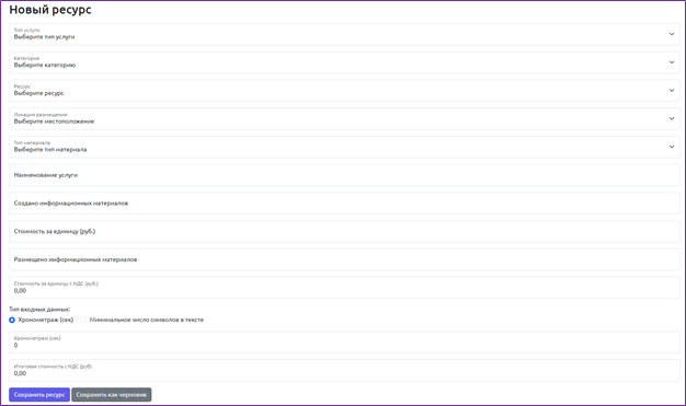 Для добавления нового ресурса необходимо нажать на кнопку «Добавить ресурс» и заполнить следующие поля:
