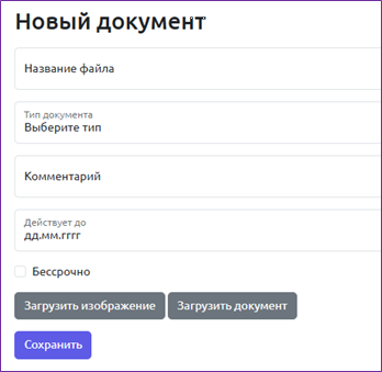 Во вкладке «Документы» доступен список документов организации. Для добавления документа необходимо нажать на кнопку «Новый документ», выбрать его тип, написать название, указать срок действия, а также вид – изображение либо документ.